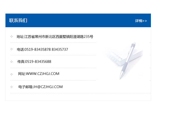 傳真:0519-83435688    郵編:213135    網址:WWW.czjhgj_com.shjieji.com    電子郵箱:JH@czjhgj_com.shjieji.com